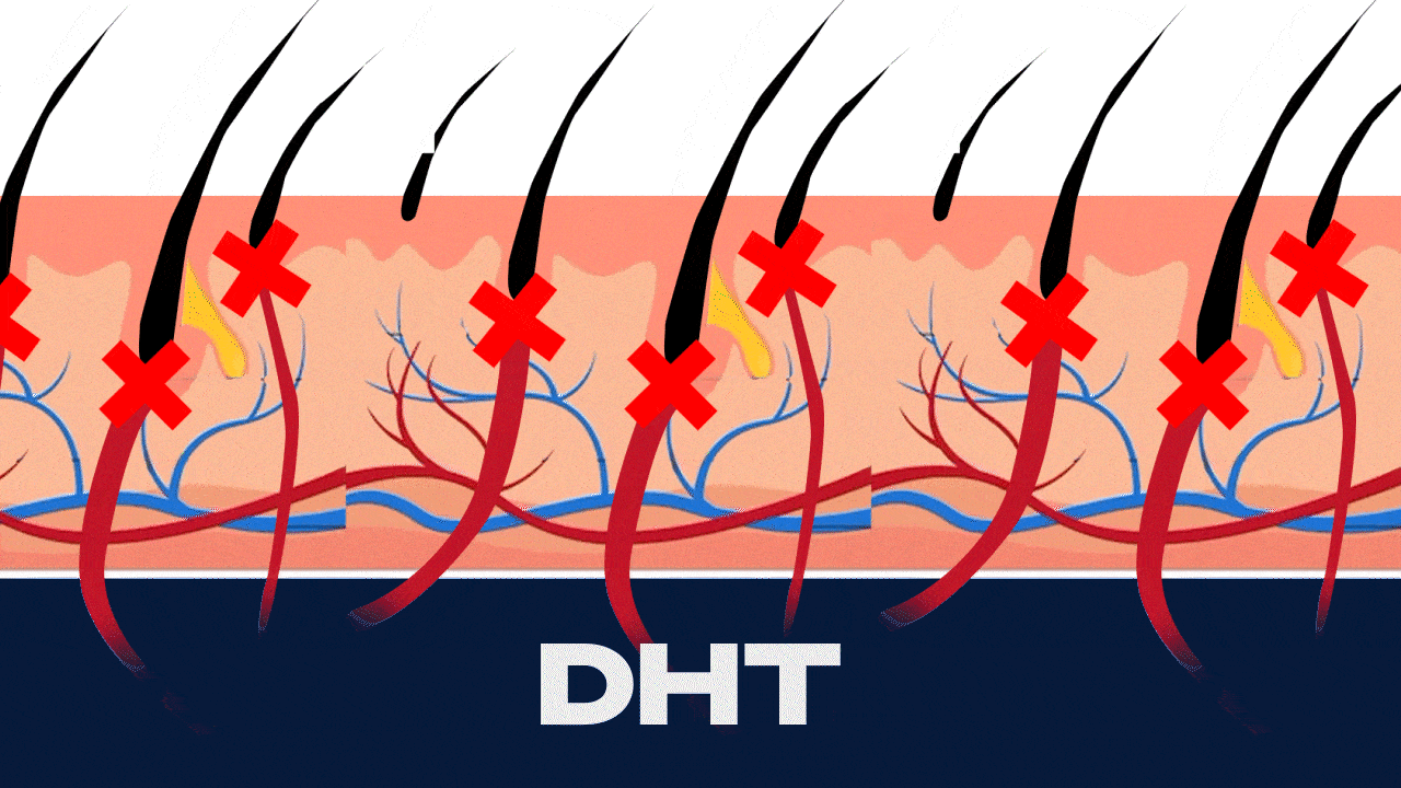 DHT shrinks follicles, restricts blood flow and cuts off oxygen and nutrients leaving the scalp undernourished and inflamed.